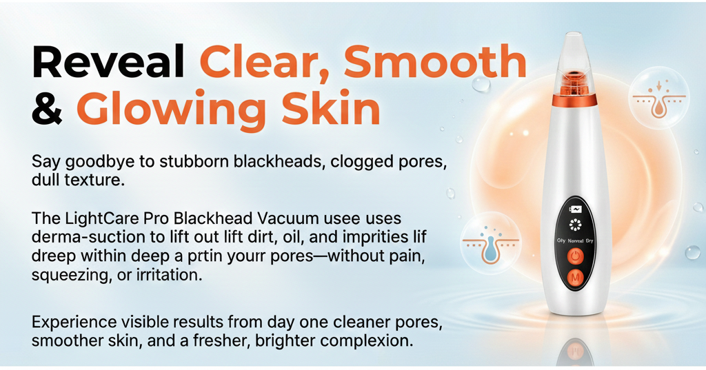 The LightCare Pro Blackhead Vacuum uses advanced derma-suction to lift out dirt, oil, and impurities from deep within your pores—without pain, squeezing, or irritation.